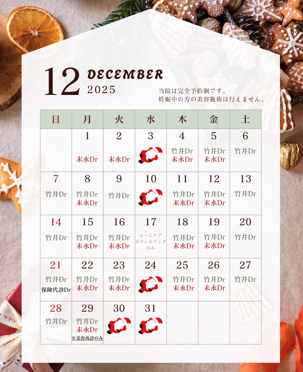 ⭐️12月29日の、自由診療(美容)は、再診の方のみのご案内となります。